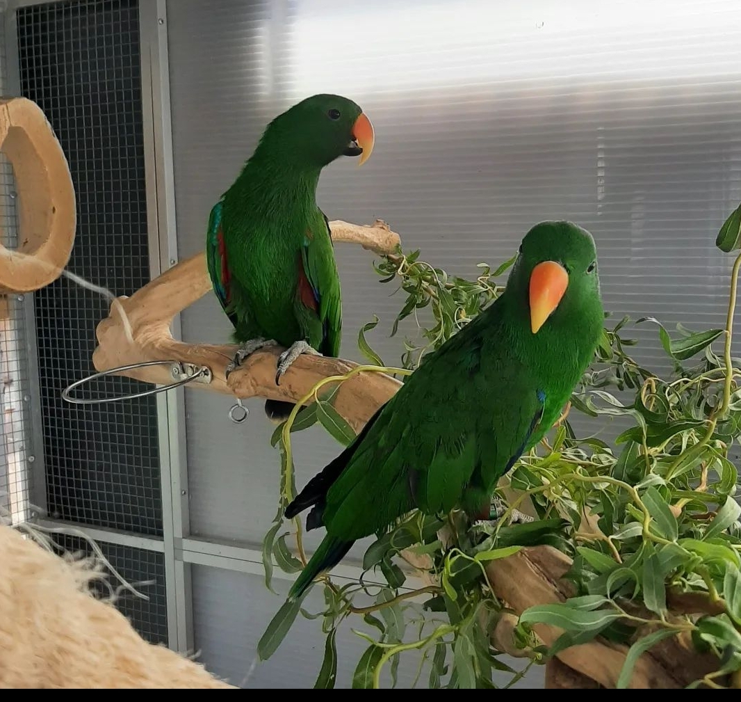 Meet Brandon and Brondy, two beautiful Eclectus parrots. They are siblings, both talk, are vaccinated and tamed. They are both very social and energetic, Brondy is more cuddly and both can get loud when left alone for too long.